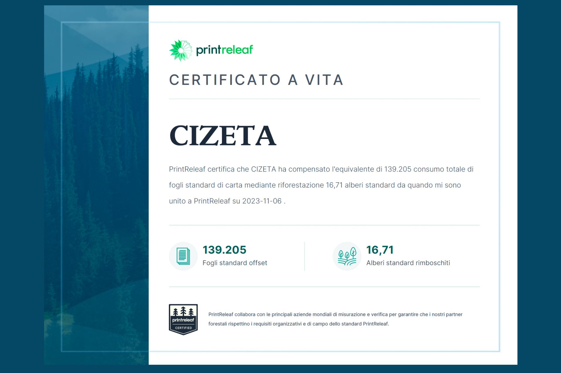 Il sistema Print Releaf permette di monitorare e calcolare le emissioni di CO2 generate dalla tua attività di stampa. Grazie a una piattaforma intuitiva e facile da usare, puoi tenere traccia in tempo reale dell’impatto ambientale delle tue operazioni di stampa. Questo ti consente di avere una visione chiara e dettagliata delle tue emissioni, aiutandoti a identificare aree di miglioramento e prendere decisioni informate per ridurre la tua impronta ecologica.